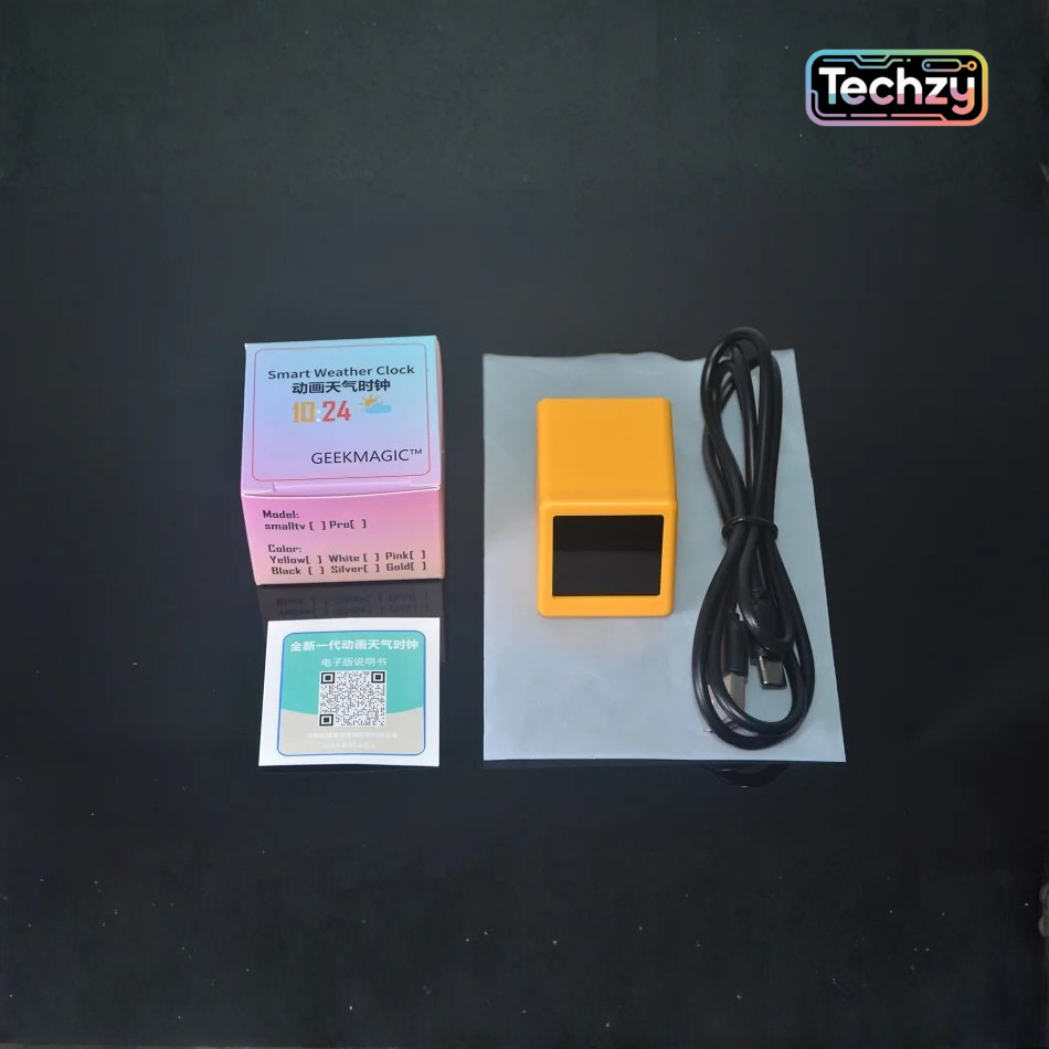 A compact smart desk clock that displays time, weather, and custom visuals to personalise your workspace.